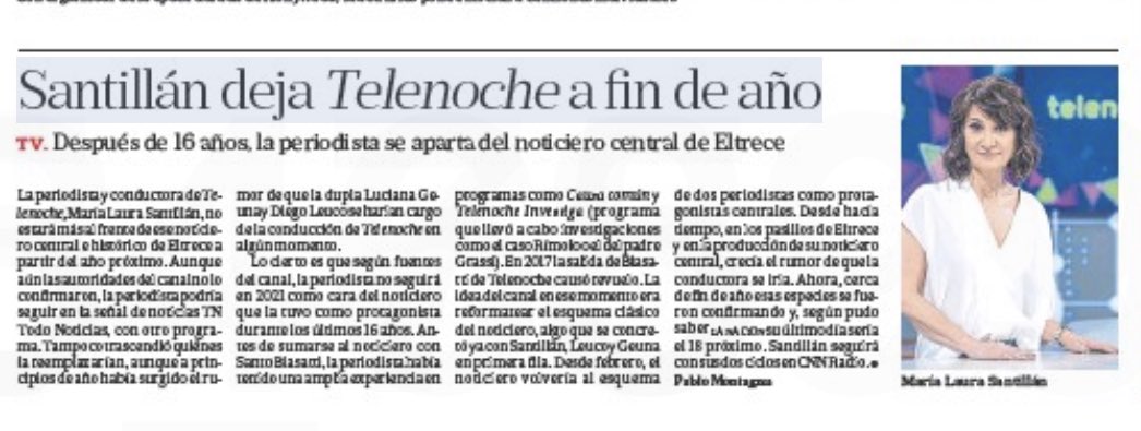 Pablo Montagna On Twitter Maria Laura Santillan Deja El Noticiero Telenoche A Fin De Ano Https T Co Vwdnp4krgt